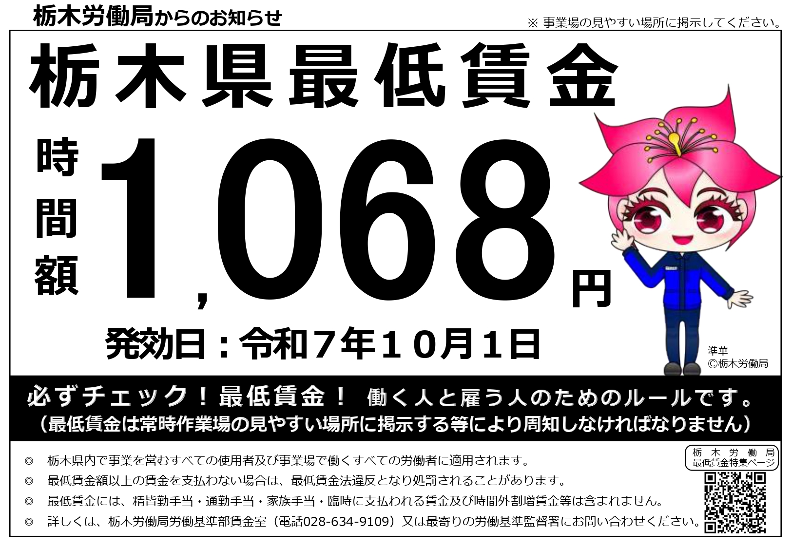 令和7年10月1日から栃木県最低賃金が時間額1,068円となります。(現在は1,004円)