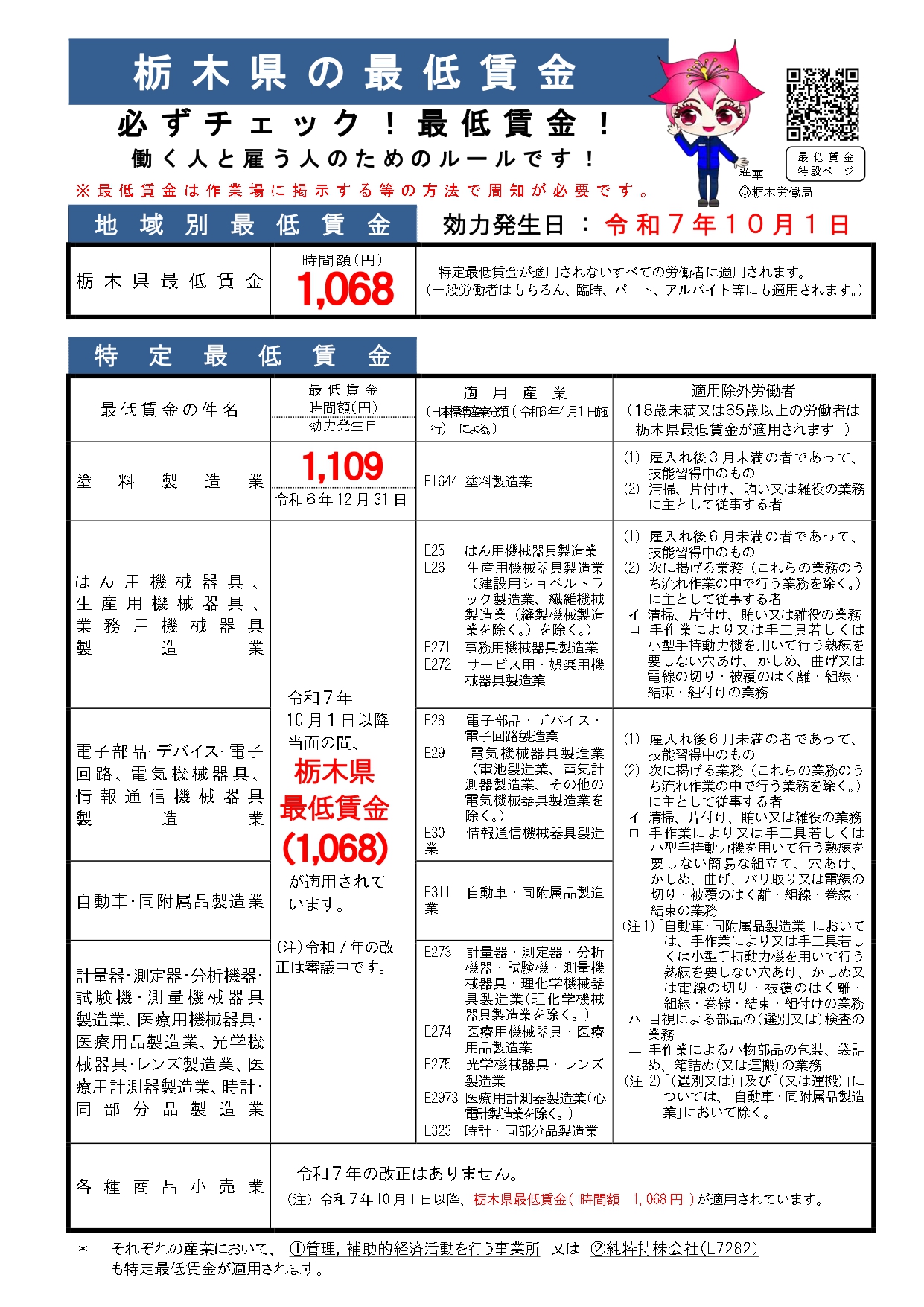 なお、特定の産業には「特定最低賃金」が定められており、毎年12月31日改正・効力発生されていますが、塗料製造業以外については、令和7年10月1日以降当面の間、栃木県最低賃金時間額1,068円が適用されます。